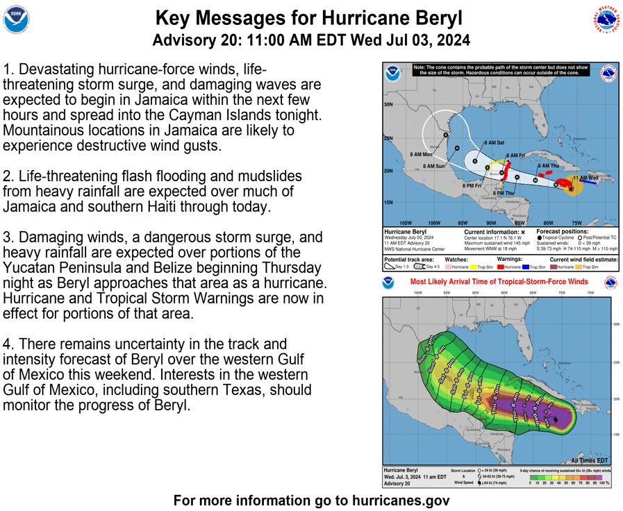 The National Oceanic and Atmospheric Administration's (NOAA) National Hurricane Center (NHC) downgraded Hurricane Beryl to a Category 4 storm from a Category 5 on the Saffir-Simpson Hurricane Wind Scale on Wednesday morning. Beryl is the earliest hurricane on record to strengthen into a Category 5 as it churns across the southeastern Caribbean Sea. It is forecasted to hit the Yucatán Peninsula on Friday and afterward poses a threat to US oil and energy critical infrastructure on the Gulf Coast.