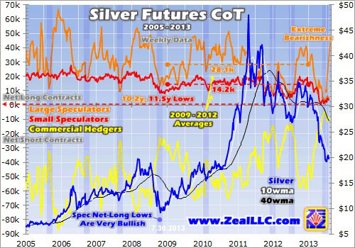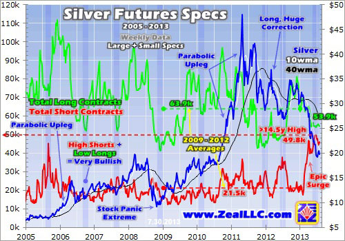 Silver has suffered a miserable year so far, bludgeoned by gold's unprecedented selling anomaly. The exceptional weakness in both metals was greatly exacerbated by futures speculators piling on short-side bets. But with silver shorts hitting record extremes, a super-bullish short squeeze now looms. Any rapid silver rally is likely to spook the highly-leveraged futures traders, sparking a massive stampede to cover. Even greater short-squeeze potential exists in gold, as I discussed in an essay several weeks ago. And gold is the dominating primary driver of silver prices. Since silver's secular bull was born nearly a dozen years ago, silver has had a stellar 0.924 correlation r-square with gold. Over 92% of all silver's daily price action in that long secular span was statistically explainable by gold's own! This is very important today. Futures speculators' total short positions in gold recently soared to wildly-outlying record highs. The only way these radically excessive shorts can be closed is by buying offsetting longs, and the sheer quantities required are gargantuan. And as the gold price surges on this heavy buying to cover, the silver price will follow it higher. Gold short covering will likely provide the initial spark to ignite the silver short squeeze. This silver buying is likely to spread like a wildfire in a bone-dry forest. Silver's great volatility and incredible potential to soar has a seductive allure that's never stamped out. There are hordes of investors and speculators waiting to buy, ready to pounce on any significant rally. Even though silver's price was hammered down 39.0% at worst this year by late June, silver exhibited remarkable relative strength. Gold plummeted 28.3% over that same span, the victim of levitating stock markets spawning a mass exodus out of the GLD gold ETF and gold-futures forced liquidations. In normal major gold selloffs, silver often doubles gold's losses. So only being down 3/8ths more than gold is impressive. This was partially due to incredible resiliency in the flagship SLV silver ETF, which stock traders didn't abandon like GLD. As of the middle of this week, the heavy differential selling pressure on GLD had bashed its holdings down 32.6% year-to-date! That is a breathtaking record extreme, and those 440.3 metric tons of gold that its custodians had to sell to keep it tracking the yellow metal were the major cause of gold's 2013 selling anomaly. Yet over this same span, SLV's holdings grew by 3.1%! Yes you read that right, they rose. Despite silver being kicked in the teeth this year, stock traders didn't sell as fast as silver was being sold in the futures market. So SLV's custodians added 10.0m ounces of silver to its holdings in one of the white metal's worst years ever. This amazing SLV bullish divergence shows major latent investor interest in silver remains. So traders likely won't hesitate to flood back in as silver's short squeeze unfolds. Like gold, futures speculators' total positions in silver are detailed every Friday afternoon in the Commodity Futures Trading Commission's famous Commitments of Traders report. These are current to the preceding Tuesday, so the latest available data as this essay was published was July 30th's. And it reveals the greatest potential for a massive short squeeze ever seen in silver's entire secular bull. The CoT reports break futures traders down into three separate classes. They are commercial hedgers, large speculators, and small speculators. The commercials are businesses that actually consume or produce physical silver, so they use the futures markets simply to lock in future prices. The speculators don't deal in physical silver at all, they are purely betting on where silver prices are heading to next. Every futures contract has a buyer and a seller, a different trader on the long side and short side. And futures are a zero-sum game. Every dollar won by one trader is a direct dollar loss for the opposing counterparty. Thus the total longs and shorts in silver are always perfectly equal. But across the three classes of traders, net-long and net-short positions arise. And these are what herald the short squeeze. This first chart looks at the silver-futures net positions held by large speculators, small speculators, and commercial hedgers over the past 9 years or so. The weekly silver price as of each Tuesday (the day that the CoT reflects positions) is superimposed. Silver-futures speculators have waxed extremely bearish in 2013, which is certainly understandable. But these guys' collective bets are a strong contrarian indicator.