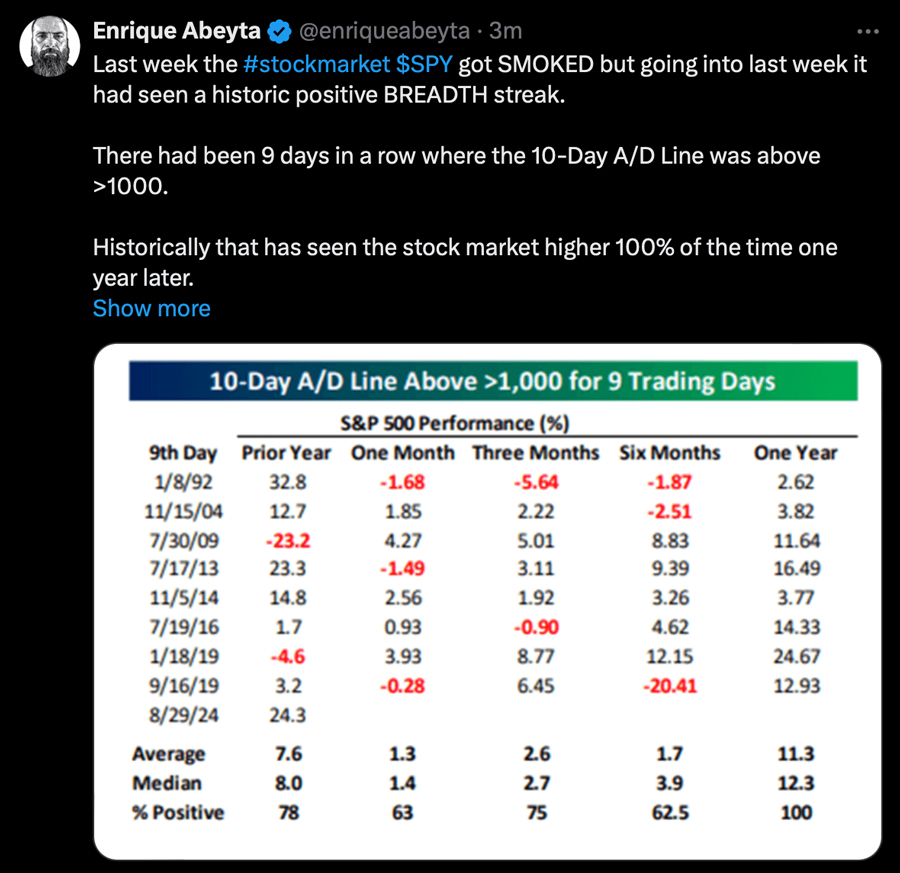 For starters, the market was looking constructive heading into the month. Market breadth was expanding (a fact we noted numerous times during the August snapback). As Enrique explains, expanding breadth is a reliable sign that the market will be higher following these bouts of turbulence. That’s great news for longer-term-minded investors.