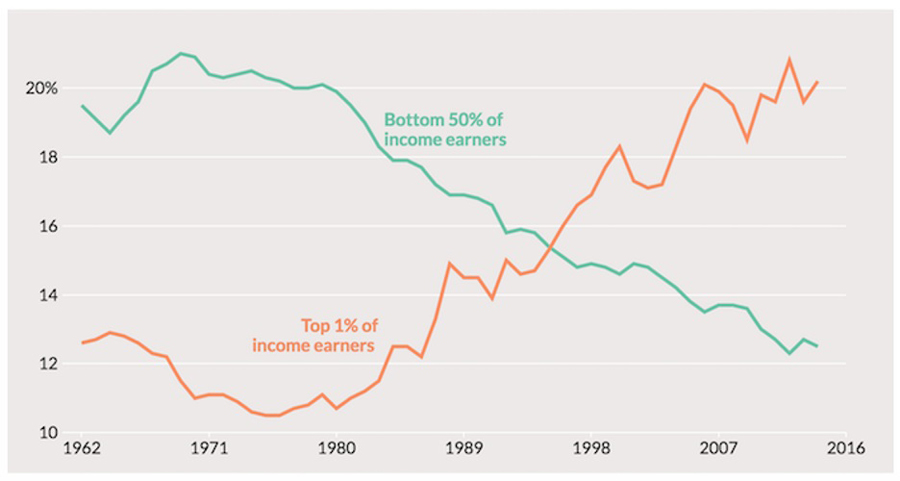 Of course, the pattern (and lesson) after LTCM was not headed, it simply continued… The Dot.Com Anti-Heroes…Just as the smoke was rising from the Connecticut rubble of LTCM, another classic asset bubble misconstrued as free-market prosperity was playing itself out in the form of a dot.com tech hysteria. In retrospect, the dot.com implosion seems obvious. But even at the time it was happening, that market (precisely like today’s) felt, well: Immortal, meme-driven and surreal. Consider Dell Inc. It started at $0.05 per share and grew to $54.00/share (a 1,100X multiple), only to slide back to 10.00/share. Today, similar unicorns abound and the magnificent 7, which comprise 30% of the S&P’s market cap (while violating every principal of the anti-trust laws I studied in law school) continue to act as sirens seducing FOMO sailors to the fatal rocks. The dot.com champagne party of the 1990’s, like its predecessor in the dapper 1920’s, ended in ruins, with the S&P down 45% and the wild-child NASDAQ off its prior highs by 80% in 2003. Today’s tech, real estate and bond bubbles, by the way, will be no different in their eventual fall from grace… Playing with Rates Rather than RealityIn the rubble of the dot.com bubble, the market-enamored policy makers at the Fed began the greatest rate reduction yet seen, resulting in a wide-open spigot for more easy credit, leverage and hence debt-induced market deformations. That is, they solved one tech bubble crisis by creating a new real estate bubble. A wide and embarrassing swath of wasteful M&A, stock-by-backs and LBO deals also took place. Highlights of this low point in “American deal making” include GE’s dive from $50 to $10 share prices. Net result? Did GE’s Mr. Jeffrey Immelt take his lumps heroically? Did the company learn the necessary lessons of reckless speculation in the fall from its 40X valuation peaks? No. Instead, GE’s CEO took a bailout… Larry SummersAnd then there’s the endless Larry Summers, the veritable patient-zero of the derivatives cancer… Larry Summers was the president of Harvard. He worked for Clinton; served as a Treasury Secretary. He made lots of opinionated (and well paid) speaking appearances. Even Ray Dalio hangs with him. But let’s not let credentials get in the way of facts. As La Rouchefoucauld noted centuries ago, the highest offices are not always – or even often – held by the highest minds. Opinions, of course, differ, but it’s hard not to list Larry Summers among the key architects behind the 2008 financial debacle “Where Larry Summers Went Wrong.“ Most veterans of recent market cycles pre and post 08, concede that OTC derivatives were the heart of the 2008 darkness. Bullied HeroDuring this period, Brooksley Born, then head of the CFTC (Commodity Futures Trading Commission)- openly warned of the derivative dangers of, well…derivatives. But in 1998, then Deputy Treasury Secretary Larry Summers telephoned her desk and openly bullied her: “I have 13 bankers in my office,” he shouted, “who tell me you’re going to cause the worst financial crisis since World War II” if she continued moving forward in bringing much needed transparency and reporting requirements to the OTC market. Larry then went on to attack Born publicly, condescendingly assuring Congress that her concerns about the potential unwieldiness of these instruments were exaggerated. As he promised: “The parties to these kind of contracts are largely sophisticated financial institutions that would appear to be eminently capable of protecting themselves from fraud and counter-party insolvencies.” But fast-forward less than a decade later (and an OTC derivatives market which Summers helped take from $95 Trillion to $670 Trillion), and we all learned how those “eminently capable” and “largely sophisticated financial institutions” (Bear, Lehman, Goldman, AIG et al…) created the worst financial crisis (and bailout) since World War II. More Bad Ideas, More Anti-HeroesIt’s worth remembering that neither Greenspan in 01 nor Bernanke in 08 ever saw these market crashes coming. Of course, neither did any of the “heroes” running the private banks or the US Treasury. Powell will be no different. The Fed’s record for calling a recession or market implosion in 0 in 10. Revisiting “Success”A man, Walt Whitman reminds, is many things. Most would agree that we are philosophically, economically, morally and historically designed to screw up – over and over again. What is less forgivable is not a lack of perfection, but rather a lack of accountability, even humility. We can’t all be brave RAF pilots. But sometimes, just being honest is heroic enough. Unfortunately, the anti-heroes touched upon above, and the countless other Wall Street “supermen” (whose executive to worker salary ratios are at 333:1) do not represent anything close to serving a cause greater than one’s own income or position. Anti-heroes like those above help explain the graph below and the new Feudalism that has replaced American capitalism:
