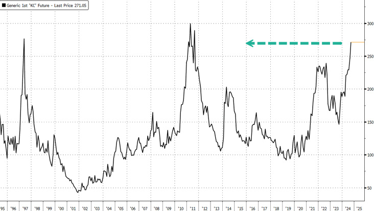 Coffee rallies have been gathering pace from ongoing concerns about harsh weather in top producer Brazil. The nation is wrapping up its 2024-25 harvest and production prospects weakened after heat and dryness hurt fields. Attention is now shifting to next season's potential, and Brazil has been gripped by its worst drought in decades, threatening further crop damage.-BBG