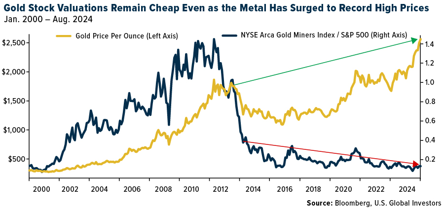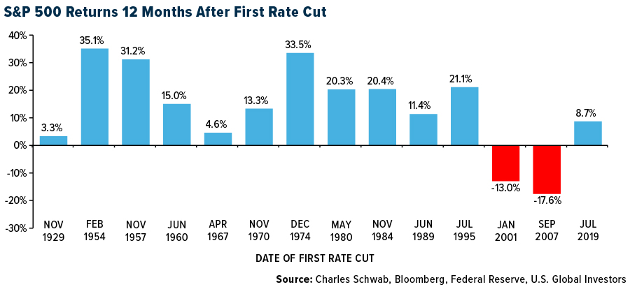 What some investors may have overlooked, I’m afraid, is the long-term potential of the very assets they were letting go of. Gold stocks, unlike the physical metal, offer not just a hedge but also a means of participating in the upside of gold prices. Put another way, when gold prices have gone up, gold stocks have historically tended to rise even more. Right now, I believe these stocks are offering an unprecedented combination of low valuations and high potential returns. A Contrarian Take On Gold Stocks As contrarians, we understand that the best time to invest is often when sentiment is at its lowest. And sentiment around gold equities is pretty low right now. But history tells us that this could be the perfect time to buy. As you may be able to tell in the chart above, we’re seeing a reversal of the gold ETF selloff. Since mid-May, investors have added about 2.3 million ounces of gold, according to Bloomberg data; holdings now stand at their highest level since February of this year. This could be just the beginning. If real interest fall substantially, the tide could turn in favor of gold and gold equities. $3,000 Gold By Mid-2025? Historically, gold’s biggest gains have occurred when the Federal Reserve cuts interest rates amid economic uncertainty. Although there’s no obvious crisis on the horizon, markets are pricing in a 25-basis point cut at each of the next two Fed meetings in September and November, with a larger cut expected in December. If the Fed follows through, we could see gold prices not only maintain their current levels but soar to new heights. UBS is calling for $2,700 gold by mid-2025; Citigroup, Goldman Sachs and Bank of America all see the metal hitting $3,000. Stock Market Trends After The First Fed Rate CutThat’s not to say you should dump all your equities in favor of gold, especially as the Fed is on the verge of easing. Charles Schwab recently showed what stocks did in the past when rates fell, and investors may want to take note. The stock market traded up 12 out of 14 times—or 86% of the time—a year after the Fed made its initial cut in a new easing cycle. Schwab points out that the two back-to-back negative periods were predicated on extraordinary circumstances: the dotcom bubble in 2001 and the housing crisis in 2007. Past performance is no guarantee of future results, but it’s worth considering.