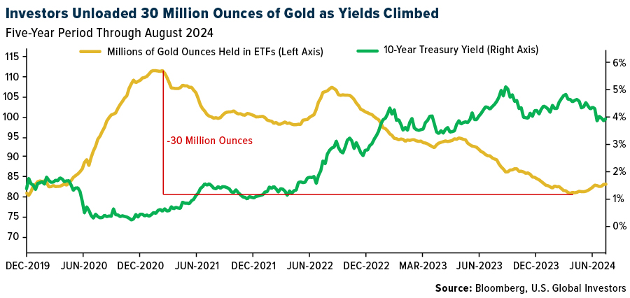 Rising Yields And The Gold Selloff Explained But first, why is this happening? The primary culprit for this disparity, I believe, lies in the impact of interest rates and central banks’ gold-buying spree. The real, inflation-adjusted 10-year Treasury yield rose from a low of around -1.2% in August 2021 to nearly 2.5% in October 2023, and for many investors, particularly those in Western countries, rising yields are a signal to sell non-interest-bearing gold. That’s exactly what happened. From the end of 2020 to May 2024, exchange-traded funds (ETFs) backed by physical gold shed approximately 30 million ounces, over a quarter of their total holdings, as yield-seeking investors pared back their positions.