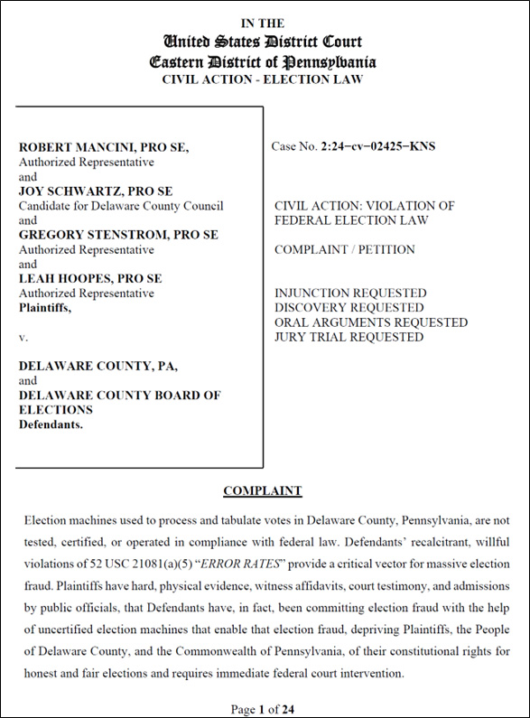 To remedy this, the author, Gregory Stenstrom, and Leah Hoopes, with “candidates” and their “certified poll watchers,” “authorized representatives,” – all codified and statutory roles defined by election law – have dozens of pending lawsuits in Pennsylvania from 2020-2024 demanding recounts and release of public election records that are coming to fruition in the appellate courts. They have also filed, or will shortly file, federal lawsuits using the evidentiary base entered into the public and judicial record over the past four years that will be heard and adjudicated by federal judges prior to the November 2024 elections. The first federal lawsuit regarding unlawful use of election machines filed on June 4th, 2024, in the Eastern District of Pennsylvania, and assigned docket number 2:24-cv-02425(-KNS) can be viewed here: https://cloud.patriot.online/s/FeTe4TME8MtXA2b Mancini, Stenstrom, et al v Delaware County et al – Violation of Federal Election Law – Error Rates The Greatest Whistleblower in US History: President Donald J. Trump