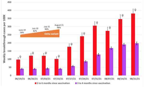 I’m not sure if they are just moving goalposts or if maybe a whole new and different game has been started, but those changes in wording are stark. Effectively, we’ve been sold one narrative for a year and are now finding out that it was never true. It’s just that the propagandists, like the Guardian, are not yet ready to catch up with the changes. Here’s thinking that will change. Meanwhile, a few billion people have been injected with substances that essentially don’t do what we were told they would. As for the effectiveness against hospitalization, that’s murky at best. For instance because in the US, as of August 7th 60% of hospitalizations were among fully-vaccinated individuals. But protection vs severe disease is the last leg the vaccine fanatics have to stand on, and they will protect that leg with all they got. Until they no longer can. And even this article admits “Effectiveness against all Covid infections fell from 88% within a month of having two doses to 47% after six months..” OK, so after 6 months they’re useless. You wouldn’t get a EUA for 47%. But what do things look like after 3 months?