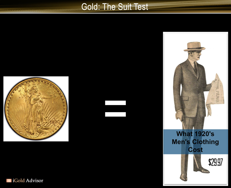 In sum, it still costs in the range of one ounce of gold to buy one fine men’s suit, just as it did 100 years ago.