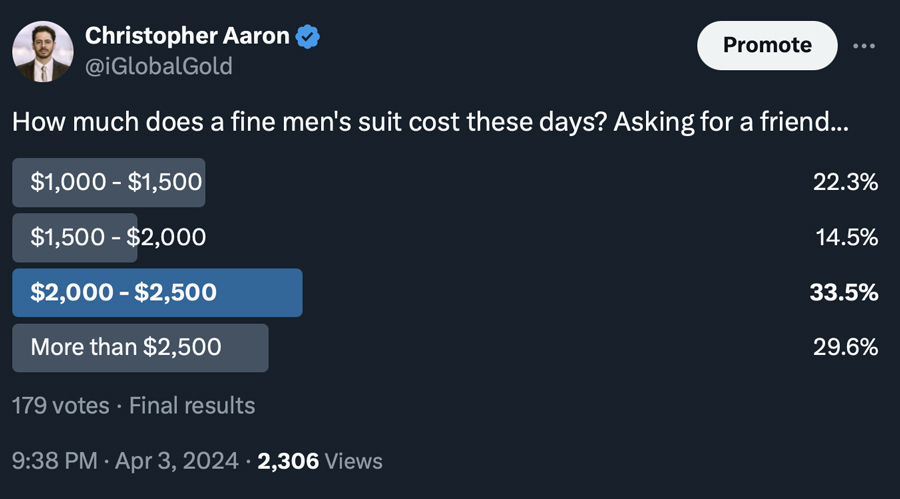 The centuries-old adage says that it should take roughly one ounce of gold to buy a fine men’s suit.