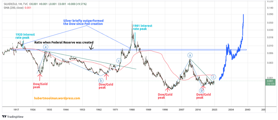 The Dow/Silver ratio needs to rise above the double blue line in order to reach parity with the Dow since the creation of the Federal Reserve. In current prices, that would mean silver’s price needs to be above $340. In the chart above, there are two similar patterns, both starting near an interest rate peak (1920 and 1981). I have marked both the patterns (a,b,c). It was only during brief periods before the 1919 and 1980 silver peaks that silver was able to outperform the Dow (see the Dow/Silver chart below). Both patterns appear to bottom very close to a Dow/Gold peak. This was recently pointed out as a sign of a coming multi-year silver rally. Point c was the key breakout point that occurred in 1973. If the comparison is valid, then the current pattern is also at point c. It is also interesting that point c was close after the key debasement events shown on my silver and gold chart analysis. It is after point c that the ratio made a move towards the double blue line (and beyond) in the 1970s. It is very likely that silver will outperform the Dow for at least the coming decade and possibly make new highs for the Dow/Silver ratio. Learn more at my premium gold and silver blog or my Silver Long-term Fractal Analysis Report . I also do some unique posts on telegram and twitter (X). Warm regards Hubert Moolman And that, knowing the time, that now it is high time to awake out of sleep: for now is our salvation nearer than when we believed.