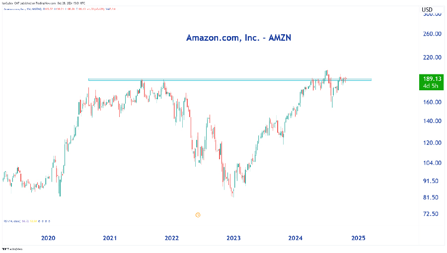 Here’s the thing about AMZN: those boxes will keep showing up on your doorstep, no matter what. But the company hasn’t exactly set the world on fire lately. Revenue fell short in 2021 and earnings missed in 2022, yet it steadily beats estimates since the start of 2023. Is there a bigger comeback in the works? Let’s check the chart: