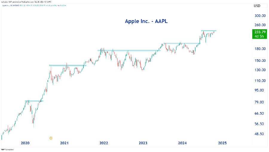 AAPL is a beast, and arguably the most magnificent of the seven mega-caps. The company has exceeded earning estimates since 2020 – no small feat! And it has crushed its past four earnings reports. Oh, and did I mention the chart is a thing of beauty? Check it out: