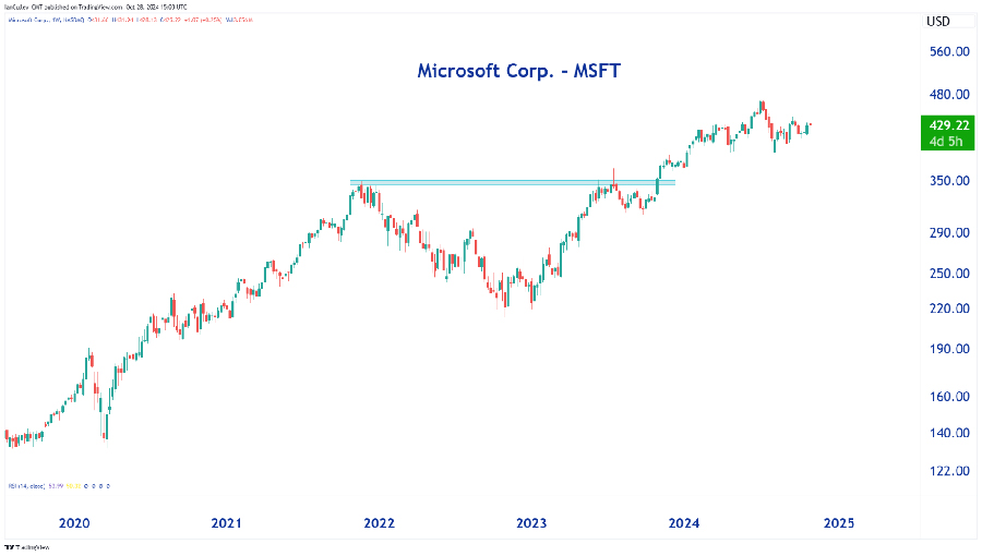MSFT has more than doubled since Nov. 2022. But the stock has essentially moved sideways for the past eight months. It’s now about 10% off its all-time high set back in July. The big question: Can MSFT escape its choppy, sideways range and continue higher? We’ll see if Wednesday’s earnings can ignite a fresh move higher to begin the journey…