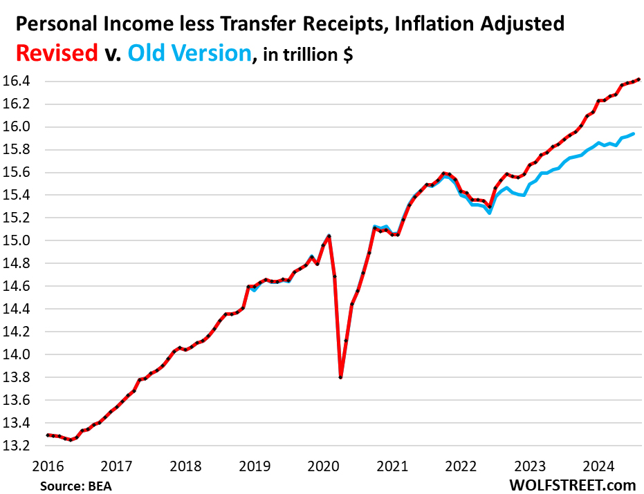 The annual revisions of consumer income and the savings rate were huge this time, going back through 2022, and consumer spending was also revised up, but not as much.