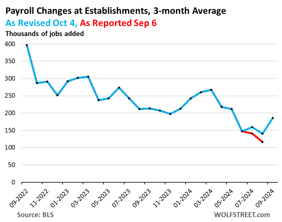But with the strong September jobs report came the up-revisions of prior data that prompted this headline here: OK, Forget it, False Alarm, Labor Market Is Fine, Bad Stuff Last Month Was Revised Away, Wages Jumped. No More Rate Cuts Needed?