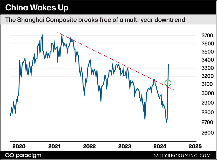 But that’s all changing as we witness a dramatic upside reversal. The Shanghai Composite didn’t just stop going down — it kicked off the new trading week by posting its biggest one-day rally since 2008. It has now ripped more than 20% over the past 5 days.
