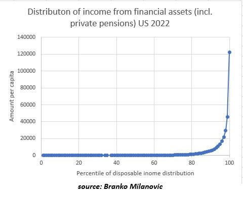 According to economist Branko Milanovic, who studies wealth and income inequality, the median annual per capita income from financial assets in the U.S. is $21.89. Yes, $22, enough for a few Happy Meals.
