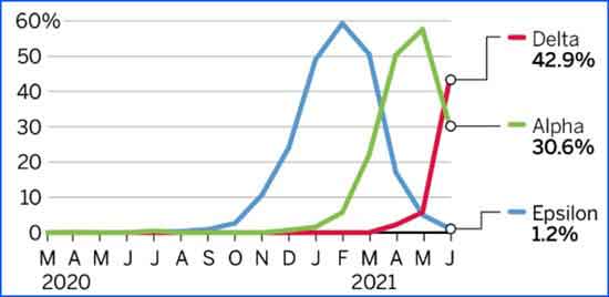 A ‘protein’ then is a specific necklace made up of a very specific pattern of colors and shapes. Because of that unique assembly, every protein has entirely different shapes and functions from all the others. You’re read a lot about the spike protein – that is an ~1286 long amino acid chain. Because of its precise ‘string of beads’ it binds extremely well to human ACE2 receptors (and several others, unfortunately) but far less so to other species. Were the string of beads any different at all, it would either lose or gain some of its many functions that allow it to bind to and enter humans cells. With that background, we can discuss “variants.” Each variant is a faithful copy of a virus that was rather unfaithfully copied. Mistakes were made during the reproduction of the genetic (or nucleic) instructions. Because of those instructional errors, the new genetic code does not code for the original virus particle with its very precise protein strings, but instead has one or more of those amino acid ‘beads’ replaced by another. If the original colors of the necklace were: red-blue-red-yellow-green-green-blue Now they might be: red-red-red-yellow-green-green-blue Every variant has a unique ‘fingerprint’ at least one or usually many of these exchanged amino acids. The wonkish details include the way these things are talked about using scientific shorthand, which you’ve certainly encountered by now. Every amino acid used by the virus is numbered beginning with the first amino acid in the first protein and ending with he last one in the last protein. Further, each amino acid is represented by a single letter of the alphabet. So if we saw P681 that would mean there was the amino acid named Proline in the 681 position. If we saw P681R, that would be shorthand for a mutation that saw the P swapped our for an “R” or Arginine (A was already taken, so R it is!). And that’s a mutation right there! One amino acid swapped out for another. One colored shaped bead in a chain swapped out for another. A red apple for a yellow banana. New shape, new color and a brand new function. That specific mutation, P681R, was one of the more critical ones that made Delta what it was. That specific location was the P in the PRRA which was, infamously, the inserted furin cleavage site so fondly used by gain of function researchers in labs, but that’s another story for another day. 99.999% of the time mutational changes are so deleterious to the viral lifecycle that the affected virus cannot reproduce and the lineage dies on the spot. Boom! Gone. Done-in-one. But very rarely, every so often, one of them magically makes the virus even more transmissive and then that lineage is off to the races. Because it reproduces faster, better, easier it also gains “market share” very rapidly from the existing strains and before you know it, it’s the dominant strain. Like this: