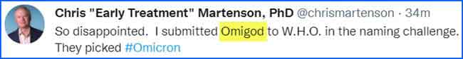 Yes, it might be poorly recognized by neutralizing antibodies. Or that might not be an issue. Or it might be that the variant doesn’t cause much harm beyond being transmissive. We simply don’t know yet. The hyperbole has been off the charts. The science and data-free assertions by a wall of so-called experts about how terrible this variant is going to be has left me practically stunned. And those of you who know me understand that I have a very high degree of tolerance for absorbing hyperbolic BS and not being affected by it. Conclusion So far it’s been much ado and hopefully about nothing. We simply don’t yet know enough of anything to state one way or the other if this new weirdly mutated variant will be of greater, lesser, or neutral concern. We can say that the fear pipes have been blasted on full and well out of proportion to what is actually known so far. We don’t know how or if those already vaccinated will fare. Better? Worse? We don’t know how the unvaccinated will fare. Better? Worse? We don’t know how the existing early treatments will perform. Better? Worse? We don’t know if B..1.1.529 is stable or if it will now spawn an entire new bevy of downstream relations (however, it’s very likely) each with their own attributes, good and bad. I will be tracking this very closely and doing what I do; informing and educating you as I perform in my role as information scout. In closing, my own entrant in the naming sweepstakes failed: