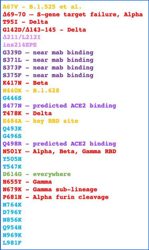 The way I read this ‘family tree’ it’s like someone reached all the way back to April 2020, plucked out an existing variant (having only the D614G mutation in common with every other clade & variant) and then somehow, magically, all by itself, came up with not one, not two, not ‘a few,’ but twenty new mutations never before seen in any other variant of concern. Here’s the complete list from @JeffreyBarett on Twitter: