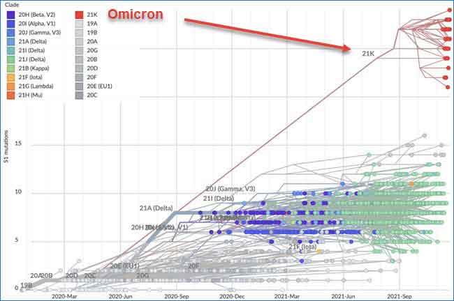 Now why the freakout? Well, probably because the family tree for this variant makes zero evolutionary sense. At least to me. So far every subsequent mutation that has led to a new variant, or to a new family of variants (called a ‘clade’) has an easily tracked family history. Each new mutation is built upon the prior mutations. If you plot these out with dots and line the resulting graph looks like a sideways shrub. Not with Omicron, or B.1.1.529. It sticks out like a whole different thing all on its own. I get concerned on a variety of levels when I see something so unusual, and I guess other people do too (but probably for very different reasons):