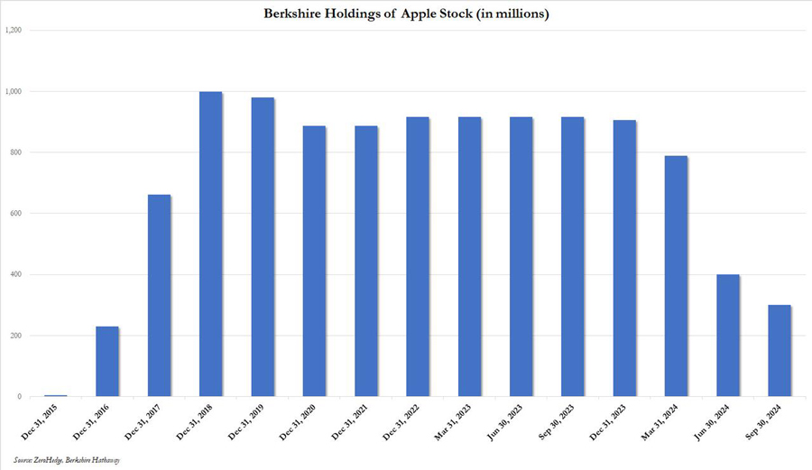 Buffett Calls The Top: Berkshire Dumps 100 Million Apple Shares As Unprecedented Selling Spree Boosts Cash To Record $325 Billion Dollars