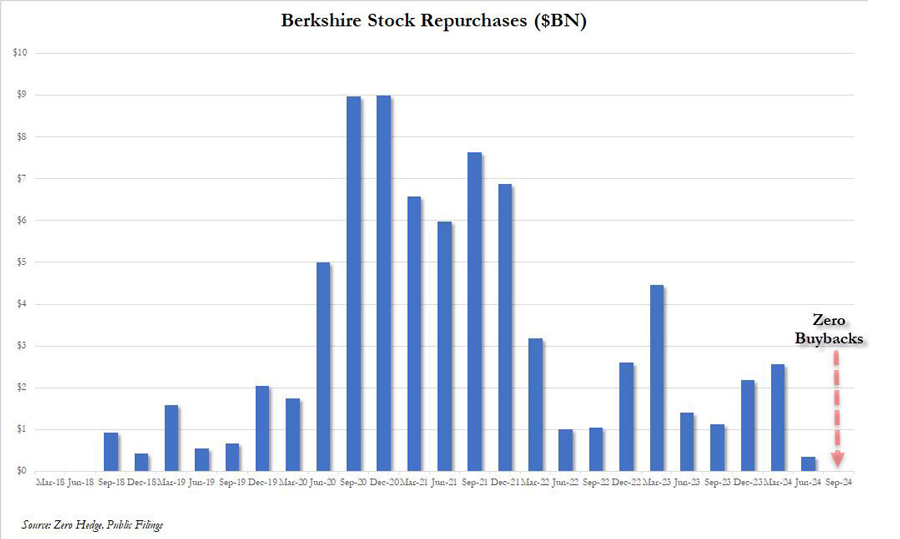 Buffett said in May that Apple would likely remain Berkshire’s top holding, indicating that tax issues had motivated the sale. “I don’t mind at all, under current conditions, building the cash position,” he said at the annual shareholder meeting. It was unclear if BRK shareholders understood that to mean a sale of 70% (and rising) of the AAPL holdings. Going down the list, with the exception of Bank of America (where Buffett is the single largest shareholder) which we already knew was also being aggressively sold – and in Q3 Buffett confirmed that he took down his BAC holdings by 23%, from 1033 million shares to 799 million which in turn made the BAC stake his 3rd largest after American Express – the rest of Berkshire’s top 5 holdings (American Express, Coca Cola and Chevron) was largely untouched in Q3, meaning that Buffett clearly decided that it was time for Apple and Bank of America to go (we have since learned that subsequent to the end of Q2, Buffett also started to dump a large portion of his Bank of America shares where he is the single largest shareholder). While Berkshire’s cash balance rose by a record $35 billion – where proceeds from the sale of Apple and Bank of America were the bulk of the new cash – the company also generated substantial cash from its own operations, and in Q3 Berkshire reported operating earnings of $10.09 billion, down from the $11.6 billion in Q2 and down 6% from a year ago, as insurance underwriting earnings slumped. The company also recorded a $1.1 billion foreign-currency-exchange loss during the quarter. Berkshire has for years struggled to find ways to deploy its mountain of cash in a sluggish deal environment, lamenting the lack of cheap opportunities. At the firm’s annual shareholder meeting in May, Buffett said he wasn’t in a rush to spend “unless we think we’re doing something that has very little risk and can make us a lot of money.” It now appears that not only was Buffett not in a rush to spend, but taking advantage of the AI bubble, he has been aggressively liquidating his biggest holding. Finally, it's not just AAPL that Buffett believes is overvalued and is aggressively dumping: the billionaire clearly believes the entire market is way expensive, and in the third quarter, Berkshire refused to repurchase any of its own shares, the first time it has done that since the company changed its buyback policy in 2018.