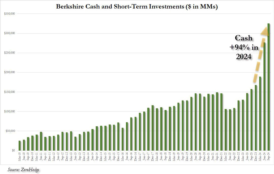 That was just the beginning, however, and this morning we subsequently learned that through the end of Q3, Berkshire’s unprecedented cash build continued, and the world’s largest conglomerate added another $48 billion to its cash – through both “harvesting” (i.e., selling of existing holdings) and cash from operations, taking it to a record $325.2 billion, or nearly a quarter trillion in cash. As shown for context in the chart below, Berkshire has nearly doubled its cash holdings from $168 billion at the start of the year to a staggering $325 billion 9 months later, up 94%!