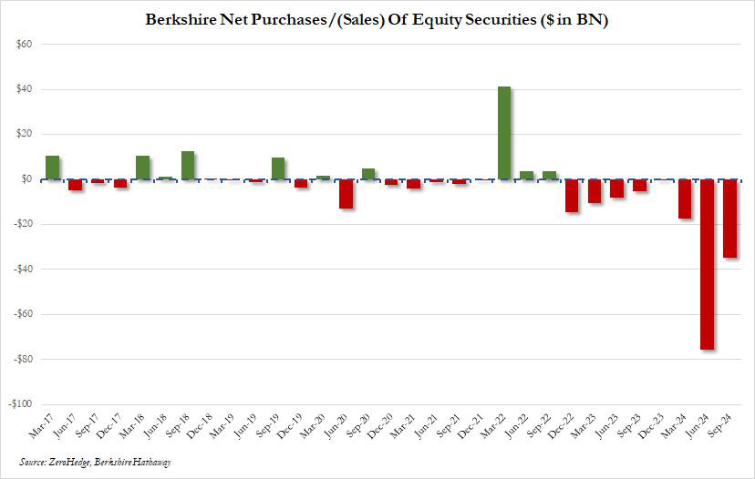 The bulk of the new cash came from sales: in the third quarter, Berkshire sold a net $34.6 billion worth of stock, following the record $75.5 billion in Q2 liquidations, the bulk of which we now know came from Buffett’s sale of half his Apple shares. In other words, the third quarter was the 8th consecutive quarter in which Berkshire has been a net seller of stocks.
