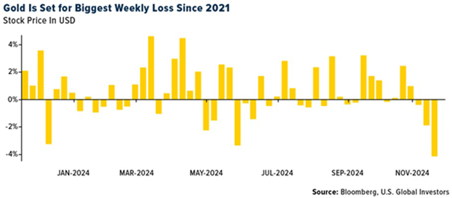 - The worst performing precious metal for the week was palladium, down 4.51%. The world’s largest gold-backed ETF recorded its biggest weekly outflow in more than two years last week as Donald Trump’s decisive election win prompted traders to book profits. SPDR Gold Shares (GLD) saw an outflow of over $1 billion, the largest weekly fund outflow since July 2022, according to data compiled by Bloomberg.