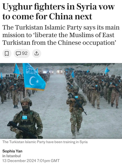 The rapid collapse of the Syrian Arab Army in the face of the advance of Turkish-backed Hayat Tahrir al-Sham… has drawn attention to the foreign fighters within their ranks. First and foremost among those foreign fighters are the Uyghurs from China’s Xinjiang Uyghur Autonomous Region. They used to fight China as part of the East Turkestan Islamic Movement but rebranded as the Turkistan Islamic Party some years back.