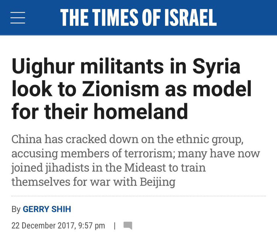 Chinese officials and Western analysts alike say that the Uighurs’ experience in the Syrian jihadi melting pot will likely exacerbate violence against “soft” targets outside China. China’s foreign ministry called the Turkistan Islamic Party a security threat for the Middle East. Uighur militants in Syria look to Zionism as model for their homeland, Times of Israel