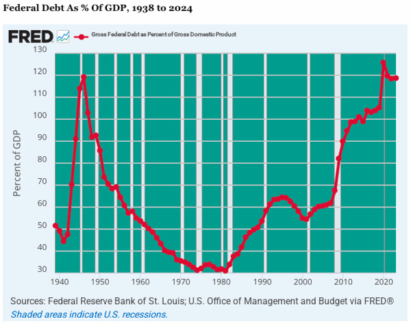 In fact, when the GOP-Dixiecrat coalition put an end to the New Deal in 1938, the public debt stood at 52% of GDP – before the exigencies of WWII sent the ratio soaring to a peak of 120% of GDP in 1946.