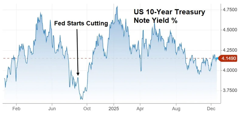 But that’s just the beginning of a very complex process. Let’s start with the fact that the Fed has already been lowering rates since September 2024: But longer-term rates have gone the other way, with the US 10-year Treasury yield (the reference rate for mortgages and car loans) rising slightly since the start of this easing cycle.