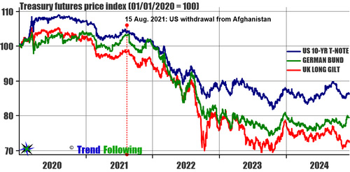 During the second quarter of 2021, US, UK and German treasuries started to recover back toward their all-time highs, but that rally failed almost immediately after the U.S. pullout from Afghanistan. Only six months later, the war for Ukraine’s democracy and freedom started. At first, as the West hit Russia with massive sanctions, a wave of optimism pushed the bond prices higher, but that optimism was very short-lived. anyone who wished to look at things as they are, rather than as they wished them to be understood that Ukraine stood no chance in that war: even Barack Obama understood this in 2014 and declined to intervene militarily. Markets trample the deluded In their collective wisdom, the markets ultimately do recognize the reality of global events and mercilessly trample over those who remain attached to their wishful thinking. Those who could look at history and large affairs with clarity could have and should have come out richer. It’s not complicated: with the internet and the social media at our disposal, attaining that clarity should be easy. All that it requires is the willingness to do one’s homework and to reject the propaganda and deception that contaminate our information space. How can we discern what’s true from what’s propaganda? That’s not complicated either: once we realize that the struggle is over collateral, we should know that the tales about democracy and freedom are false. History continuesToday, the bond markets seem to be pricing in further adverse developments in Ukraine: the British and the Europeans, who have bet the proverbial ranch on Project Ukraine now seem on the verge of the next collapse in their bond prices. At the same time, the Trump administration has taken steps to cut their losses and extricate the United States from the trainwreck. As a result, U.S. treasuries have diverged from those of the UK and Germany, which now appears to be the weakest link in the West: